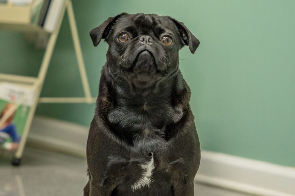 Pugsley has certainly found his stride with calming patients down, but his tactic is a bit different from that of his serene friend, Peaches. The little 23-pound, energetic pug uses comedy to distract and entertain patients at the clinic. He will jump up in the chair beside a patient and tip his head to the side, adding comic relief with his charmingly mismatched gaze.