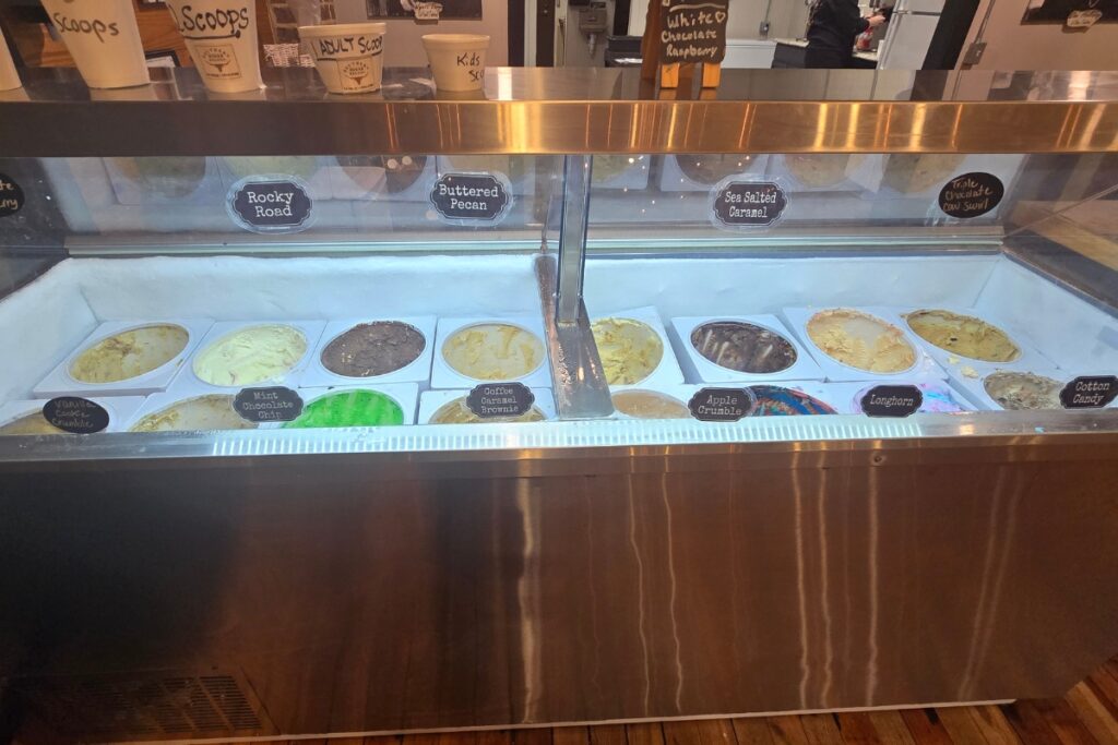 Walking through the doors feels like stepping into a charming saloon from another era. The rustic decor, warm wood finishes, and playful western details create an atmosphere that’s both inviting and memorable. It’s the kind of place where kids’ eyes widen instantly, and adults find themselves smiling without realizing it. With over 21 flavors of ice cream to choose from, a colorful wall of scoop-it-yourself candies, and a menu filled with creatively-named Western milkshakes, the hardest decision is simply where to start.