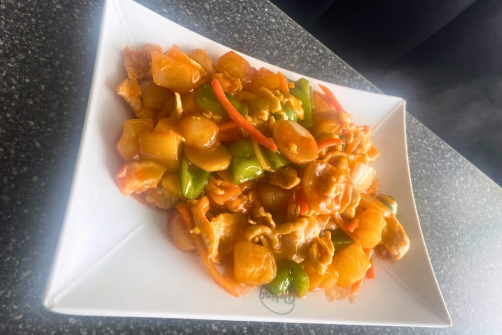 I ordered the pineapple chicken — juicy chunks of chicken tossed with pineapple, water chestnuts, onions, carrots, and peppers in a sweet, tangy sauce. It comes with a bowl of rice and could easily feed two or three. Her chicken chow mein was loaded with tender chicken, crisp veggies, and crunchy noodles that soaked up the rich sauce.