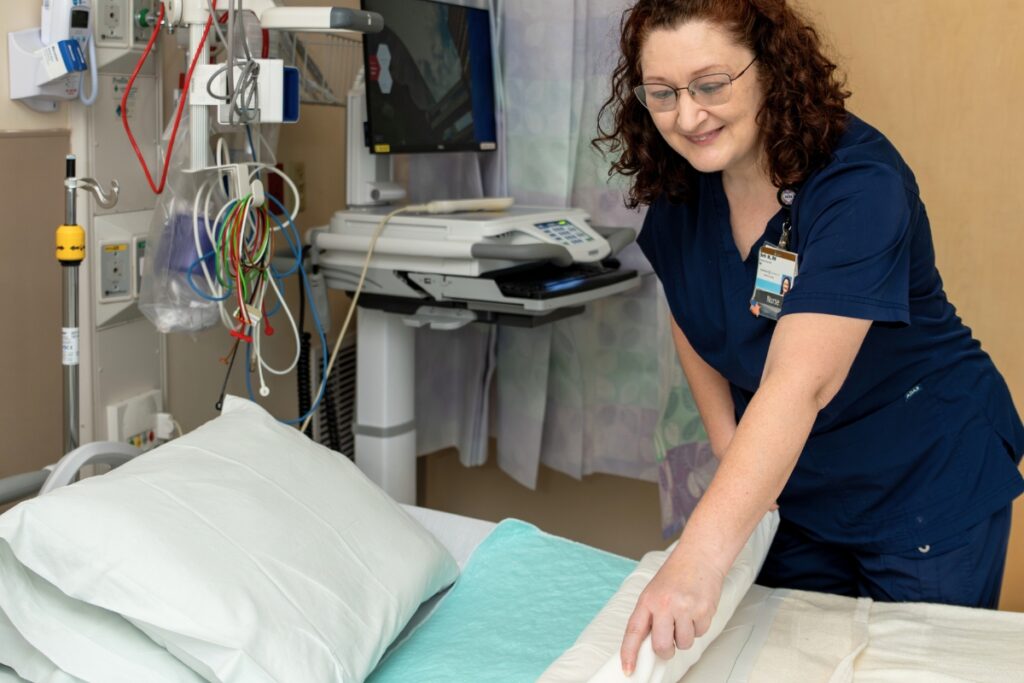 Patients receive one-on-one attention, as everyone is visible from the nurses’ station perched in the center. “Some days, we run from morning to night. Patients are very sick, and ten or more things need to be done at one time, and you can’t do it alone. As a team, we can care for our patients the way they need to be cared for. Everyone pitches in to help with whatever needs to be done.”