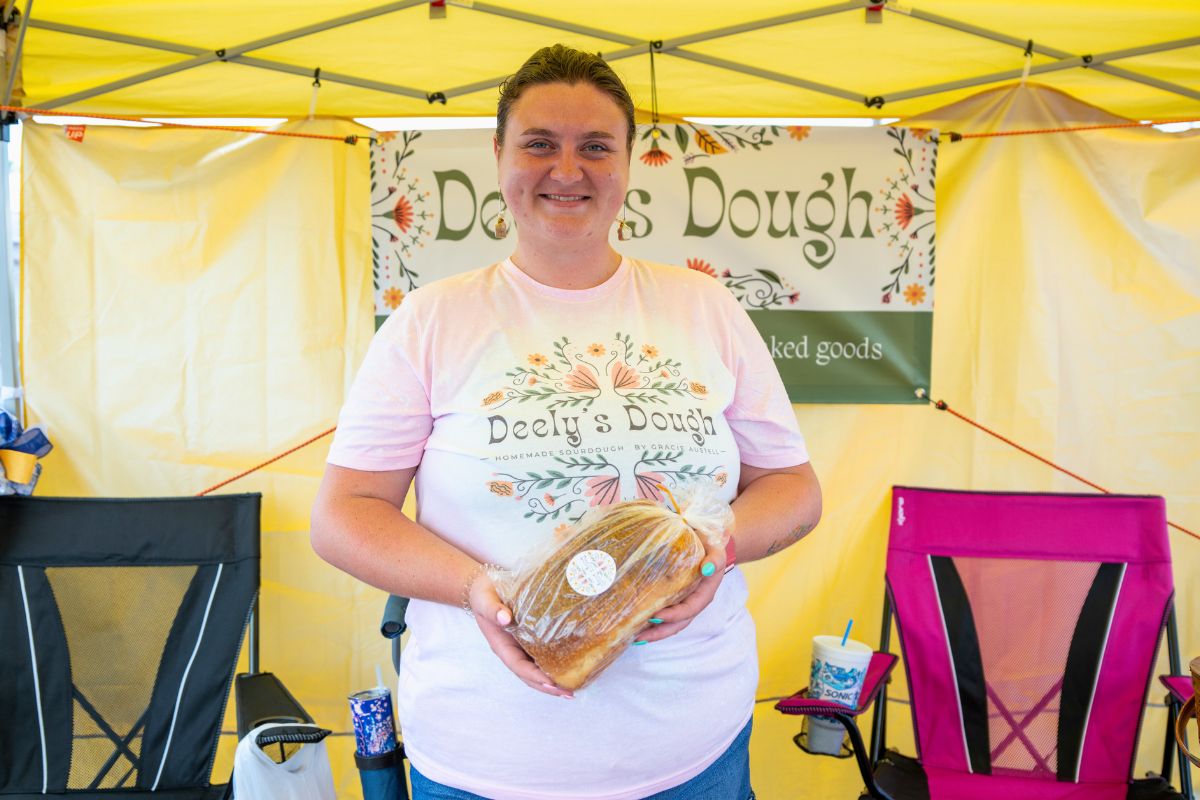 One of Austell’s unique approaches to her bread is that she doesn’t simply call it “sourdough” due to the unique ingredients in the family recipe. She lovingly refers to them as “Elsie-Dough” loaves, named after her nana. A sign on her booth explains the history and significance of the name, and there is even a stuffed chicken that always shows up for these events, which she named Ruth — her nana’s middle name. Everything about Deely’s Dough exudes family-centered, hometown charm.