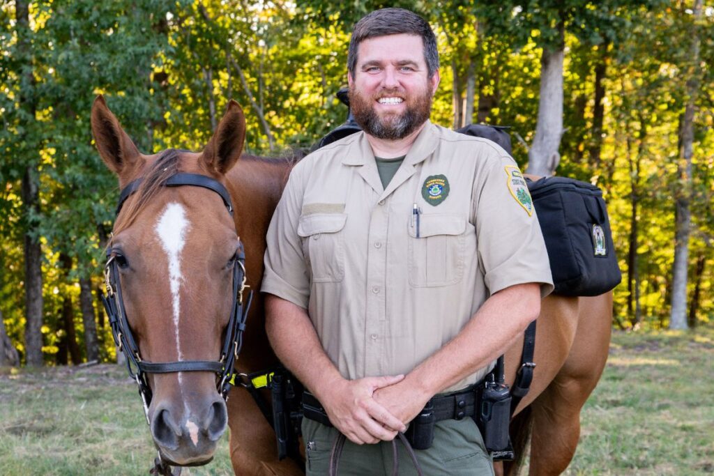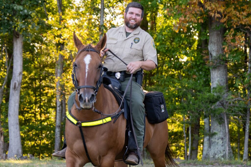 Matzkiw is also a mounted patrol officer. Tennessee State Parks are home to a group of mounted patrol rangers who assist in patrol, training, and public engagement across six parks statewide. According to the Tennessee State Parks Conservancy, these rangers and their horses are trained to respond to emergencies and patrol remote areas of state parks. The horses interact with the public, providing a friendly face at park events and enhancing the visitors’ experience.
